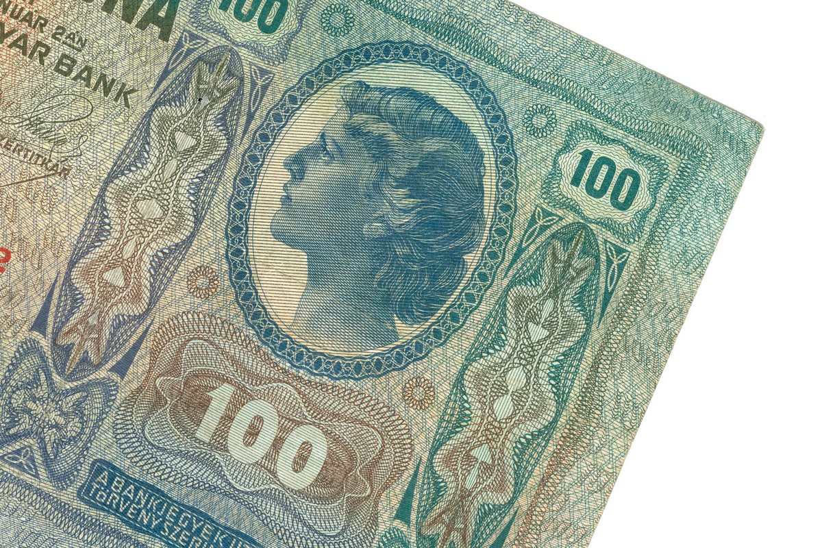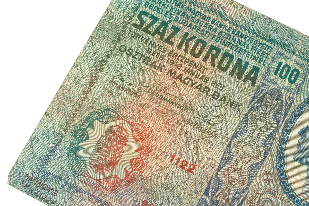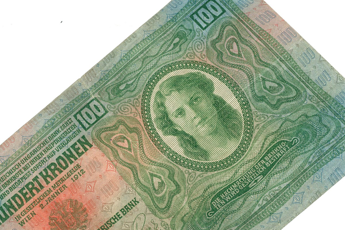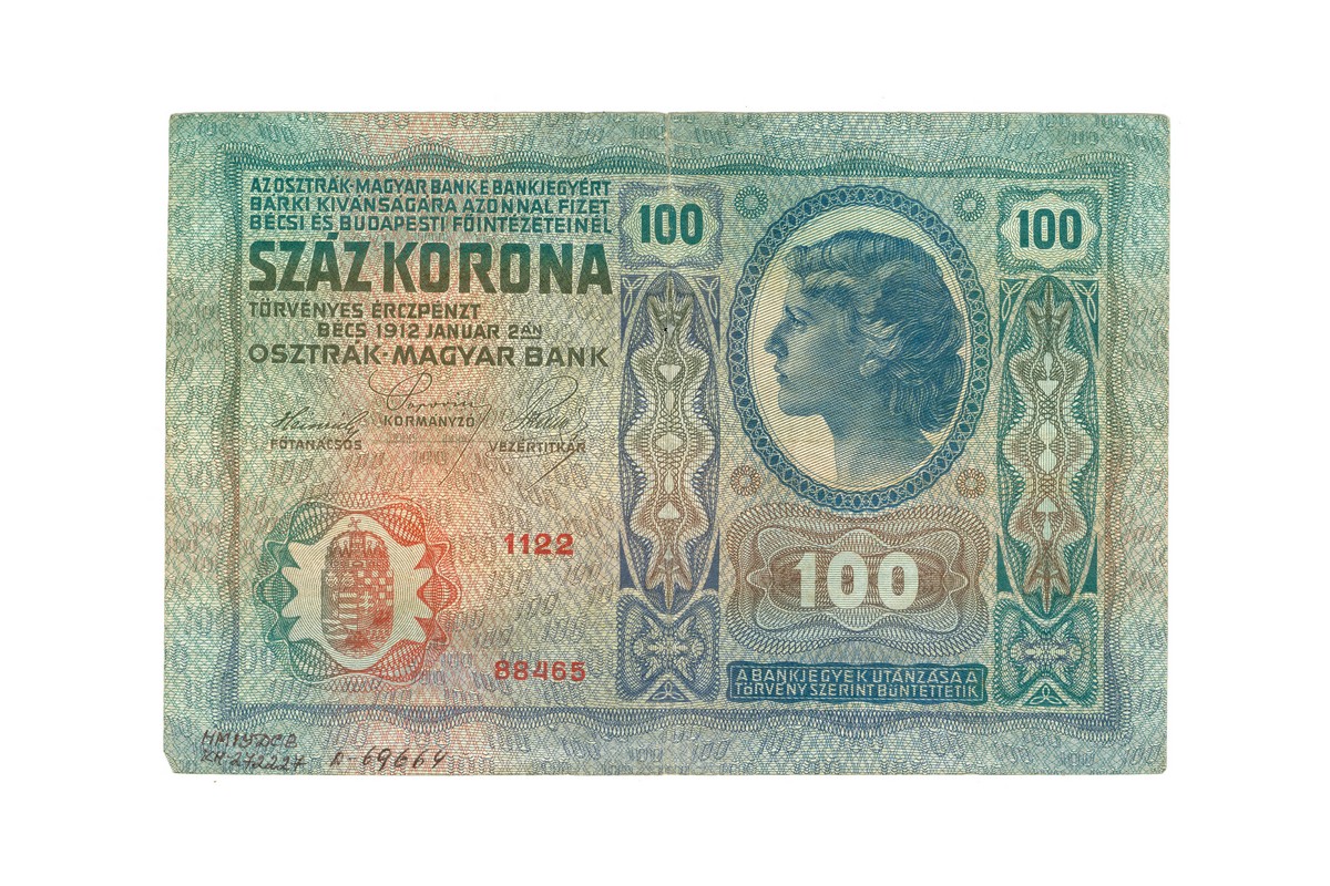 Крона – грошова одиниця Австро-Угорщини від 1892 р. до 1918 р.; була в обігу й на територіях України, що входили до її складу. Після утворення на колишніх австрійських землях Західноукраїнської Народної Республіки тимчасово стала її грошовою одиницею поряд з гривнею. Випуск банкнот номіналом 100 крон розпочато в 1902 р. Їхніми домінантними елементами стали ідеалізовані жіночі портрети. Характерною була відсутність водяних знаків. На аркуші з темними багатобарвними псевдорельєфними захисними сітками та фоновими написами цифри «100». Основний колір – зелений.