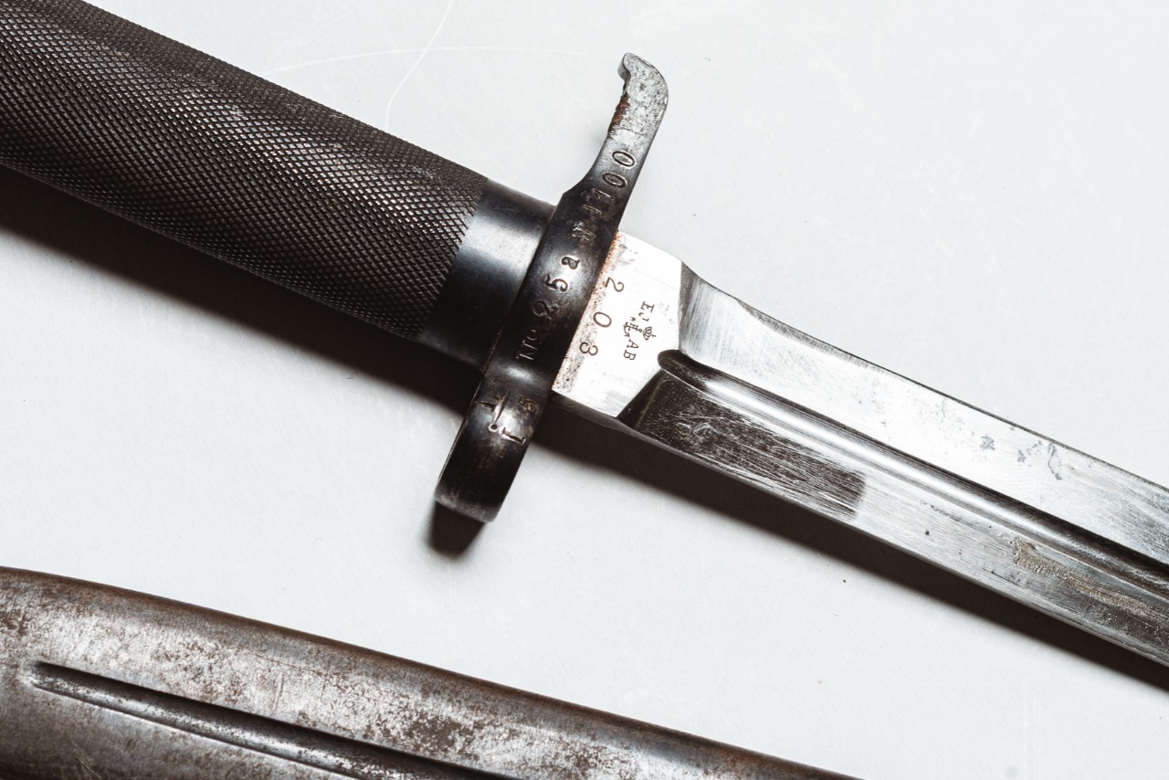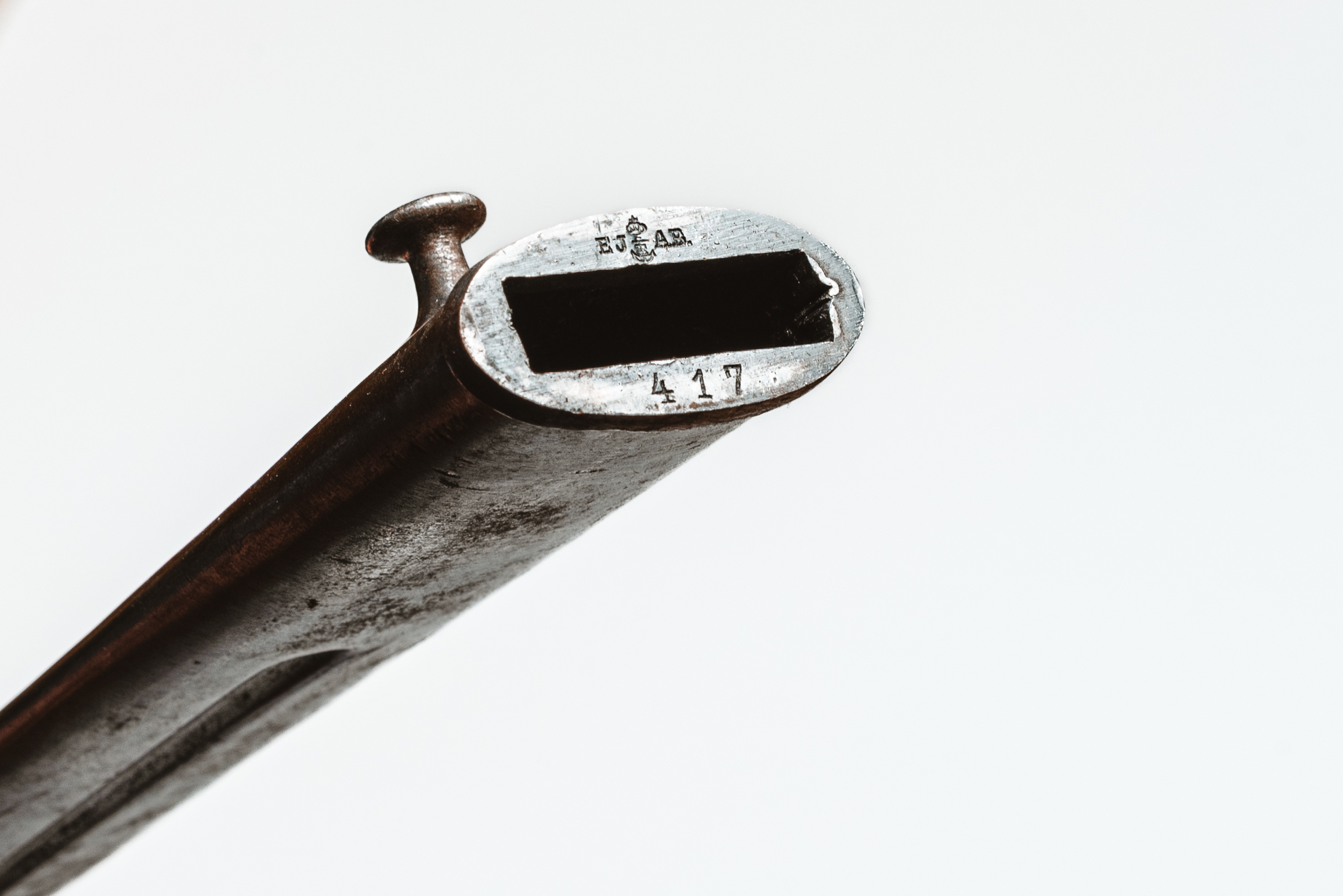На п’яті клинка і на гарді видно клеймо виробника EJAB (Eskilstuna Jernmanufaktur Aktiebolaget) — якір під короною з цифрою «203», а також викарбувану королівську корону як відбиток військової прийомки Швеції. На гарді пробито «L/I 5 № 25а, № 1100», що вказує код роду військ (піхота), номер підрозділу та серійний номер; на гирлі піхов і на кульці навершя також присутні клейма EJAB і цифра «417».