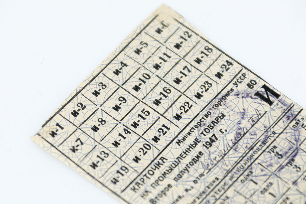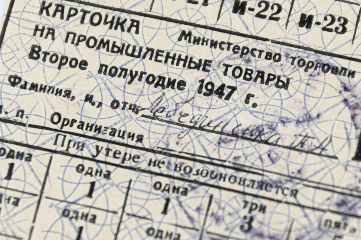 Картка на промислові товари – персональний документ карткової системи, виданий Міністерством торгівлі УРСР. Такі картки регулювали забезпечення населення промисловими товарами в умовах гострого післявоєнного дефіциту та надавали доступ до одягу, взуття, білизни й господарських речей. Кожен відривний купон означав не абстрактну цифру, а конкретну, життєво необхідну річ – пару взуття, відріз тканини, пальто чи теплий светр. На відміну від продовольчих, картки на промислові товари використовували значно рідше, проте мали не меншу цінність. Отримання одягу або взуття часто ставало подією, до якої готувалися заздалегідь: збирали купони, вистоювали черги, чекали надходження товару. Картки ретельно зберігали, інколи носили разом із документами, адже їх утрата означала неможливість законно придбати необхідні речі. В УРСР картки на промислові товари з’явилися на завершальному етапі дії карткової системи – безпосередньо перед її скасуванням у грудні 1947 р. в межах грошової реформи СРСР. Саме тому такі документи стали короткочасним, але промовистим явищем повоєнної економіки, що зафіксувало перехід від воєнного нормування до формально «вільної» торгівлі.