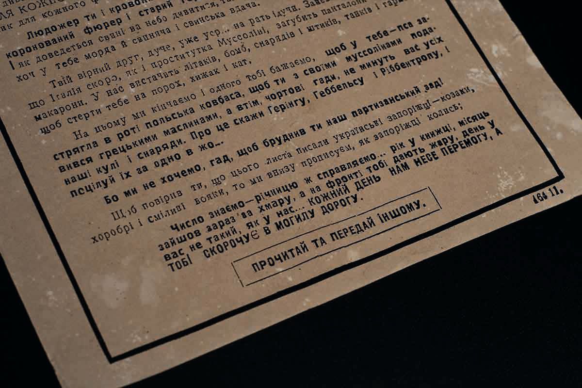 “Cannibal, bloodsucker, butcher in a brown shirt and murderer, uncrowned Führer and decrepit old Herr… Let us remind you, since your memory is short, that our Ukrainian people have always thrashed the Germans like puppies. You scoundrels were beaten by the swords of Danylo of Halych and by the sabres of Bohdan Khmelnytsky’s Cossacks. In 1918 we drove the Kaiser’s soldiers from Ukraine like dogs.”