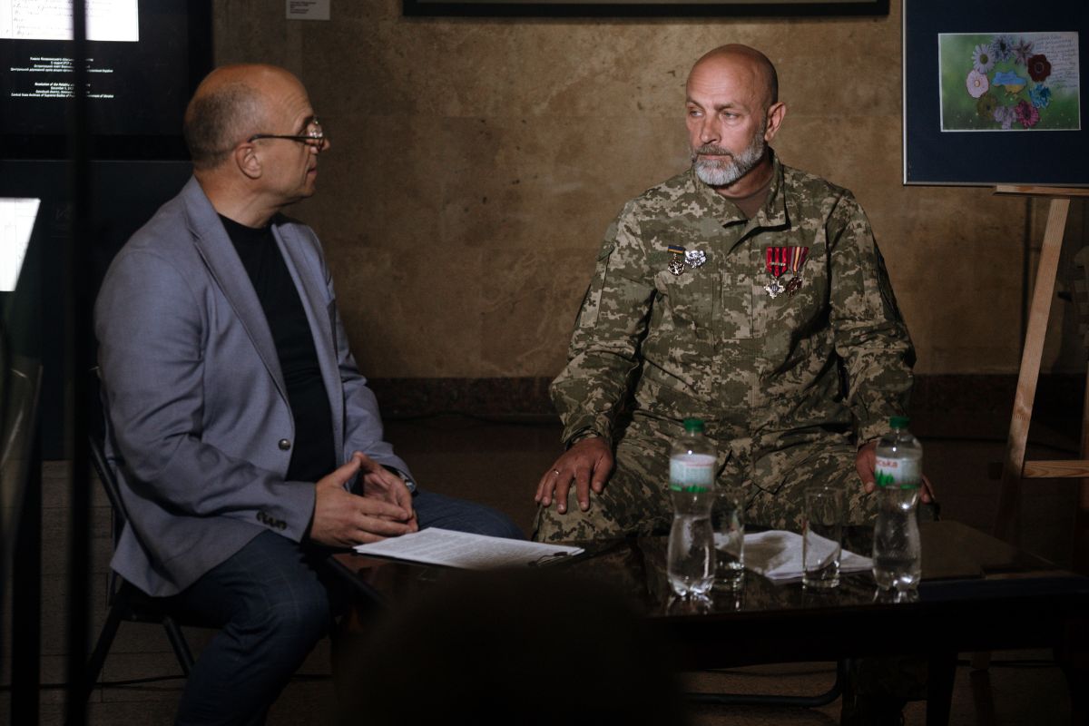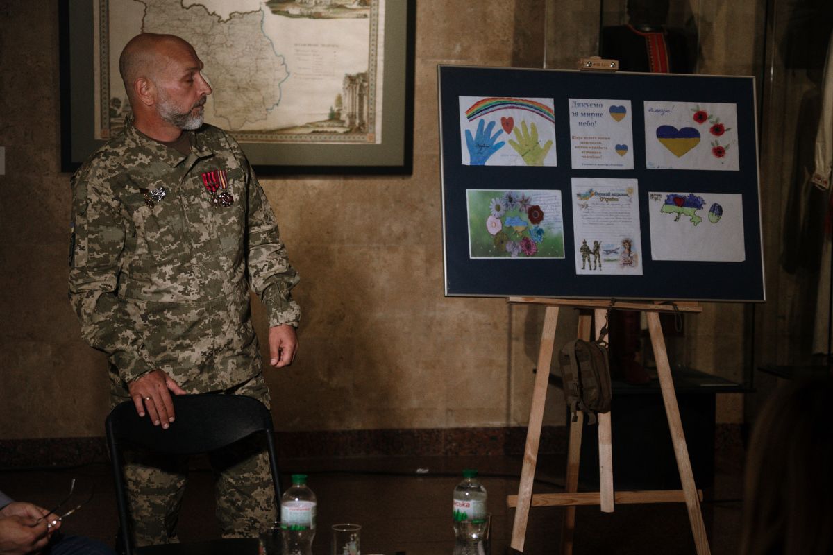 У просторі виставки «…за межею свого рідного краю» про свій бойовий шлях розповів сержант матеріального забезпечення роти ударних безпілотних авіаційних комплексів батальйону безпілотних систем 101 окремої бригади охорони Генерального штабу імені генерал-полковника Генадія Воробйова – Володимир Сачук (позивний «Сич»). Модератором зустрічі виступив науковець Музею Сергій Сірий.